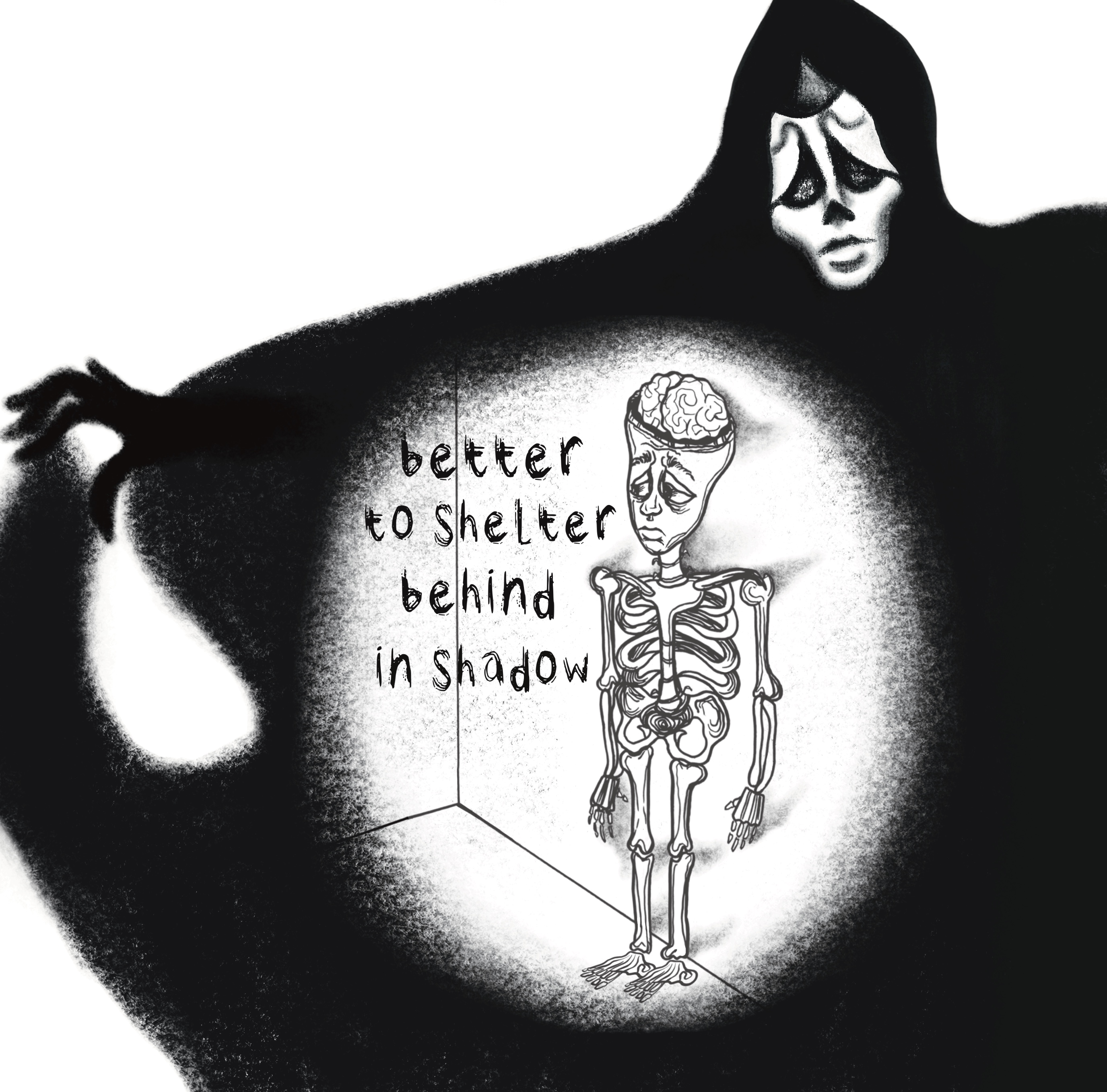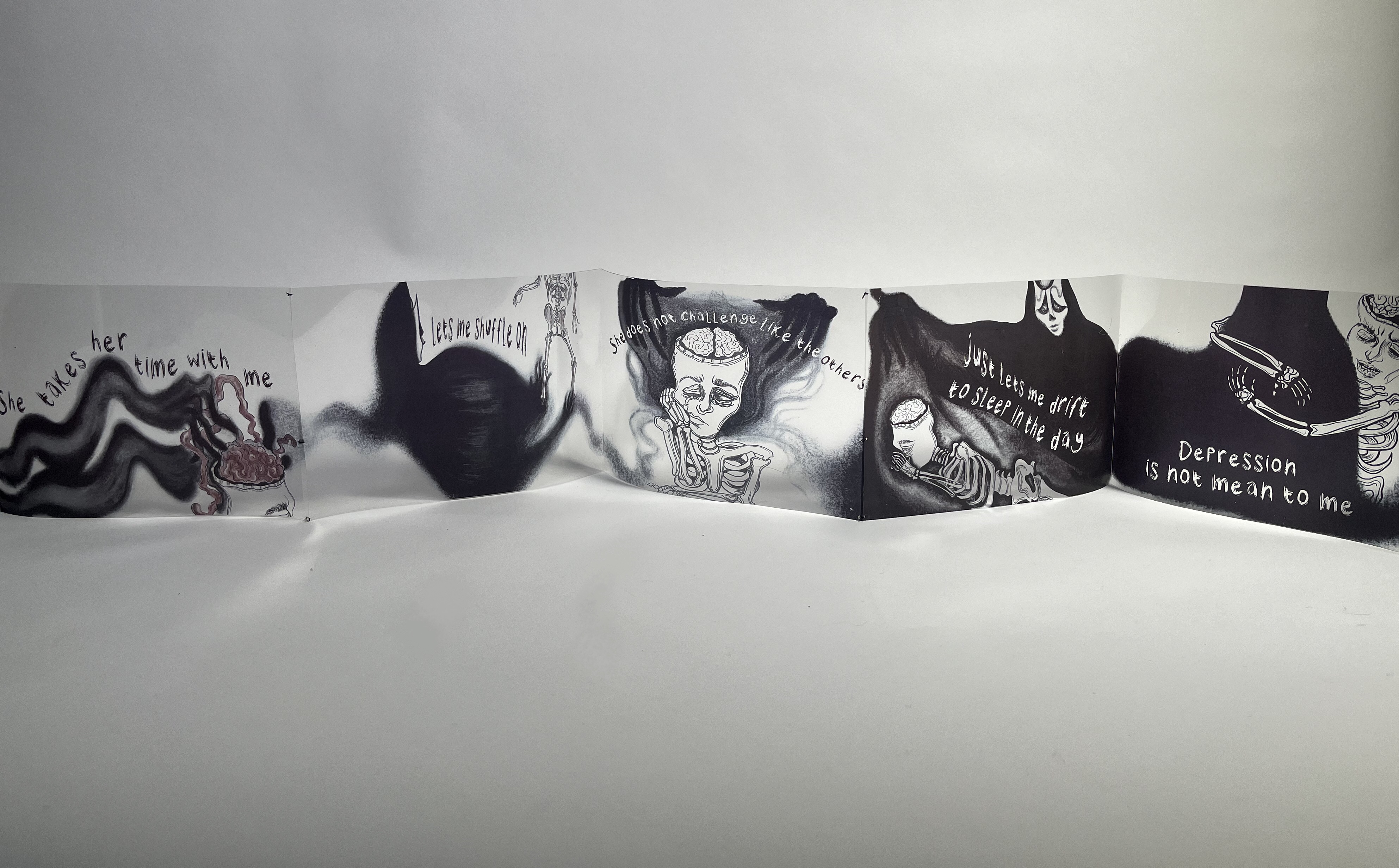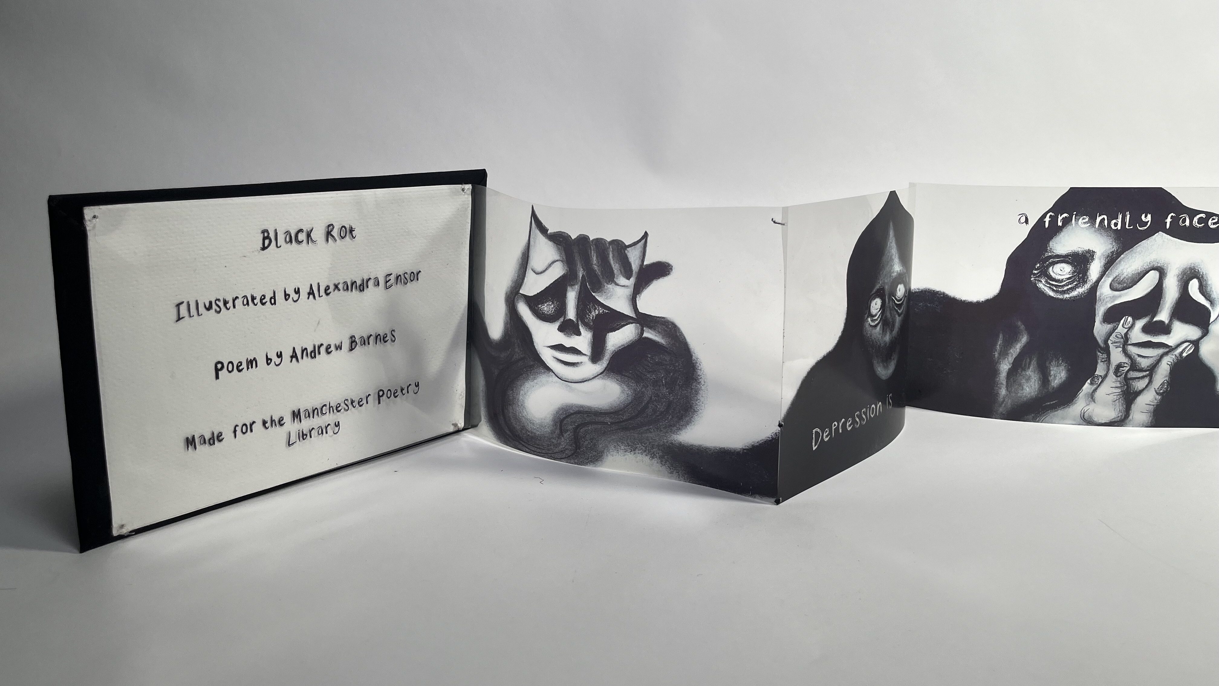 Black Rot is an accordion publication made during Ensor’s final year at university, exploring the relationship and fragility between depression and the self. Using text from Andrew Barnes’ poem ‘Black Rot’, Ensor also takes inspiration from her own experiences with depression to help form this piece. Through the use of ink and charcoal, printed and bound on acetate at 3 metres long, Ensor accentuates shadows and forms to build the foreboding and destructive nature of depression. This piece has been publicly displayed at SEESAW, and the Manchester Poetry Library.