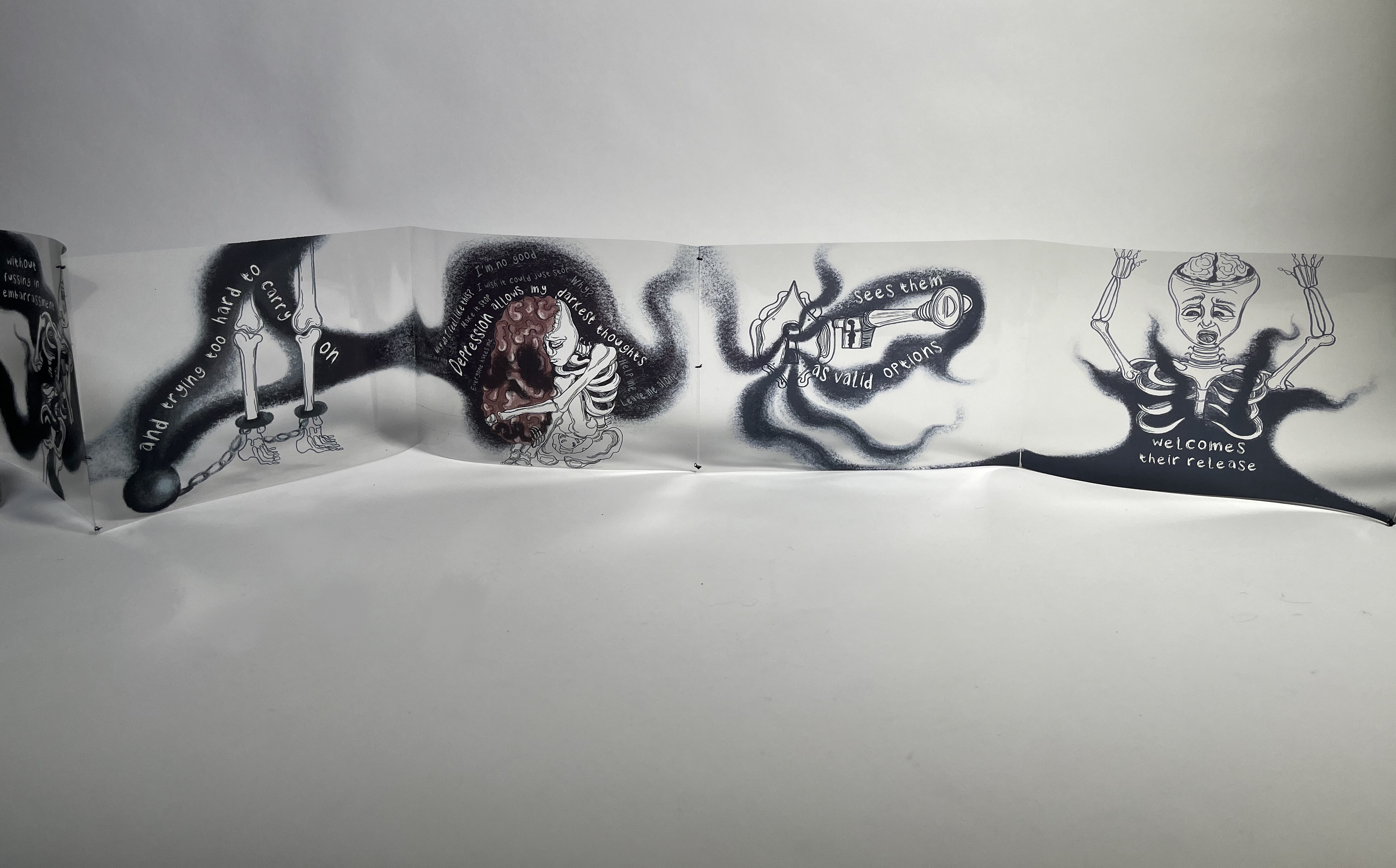 Black Rot- A mixed media illustrated publication printed and bound on acetate, exploring depression based on the poem by Andrew Barnes, 3 metres long
